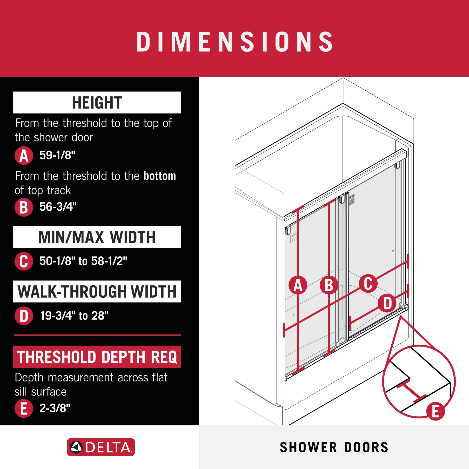 FIT: Requires opening width of 50-1/8 in. minimum to 58-1/2 in. maximum (127.3-148.6 cm) and 59-1/8 in. (150.2 cm) threshold to top of door; Offers walk-in width of 19-3/4 to 28 in. (50-71 cm), 56-3/4 in. height threshold to the bottom of the top track